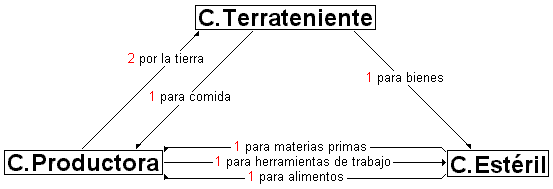 Para entender bien el significado de la fisiocracia, tenemos que pensar en un cuadro, en el que encontramos a los 3 grupos principales de la sociedad. Vemos que todos ellos reciben de la agricultura, los terratenientes, es decir, los dueños de los factores productivos, y los trabajadores, artesanos, etc. que sería el llamado grupo estéril.